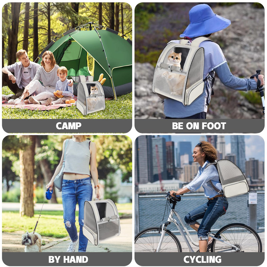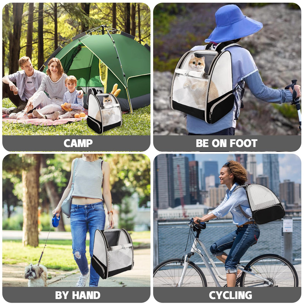 This pet carrier backpack is easy to fold for storage when not in use, taking up minimal space. It can be carried over the shoulders, secured in a vehicle with a seatbelt, placed on luggage, or lifted using the top handle, offering versatile transport options.